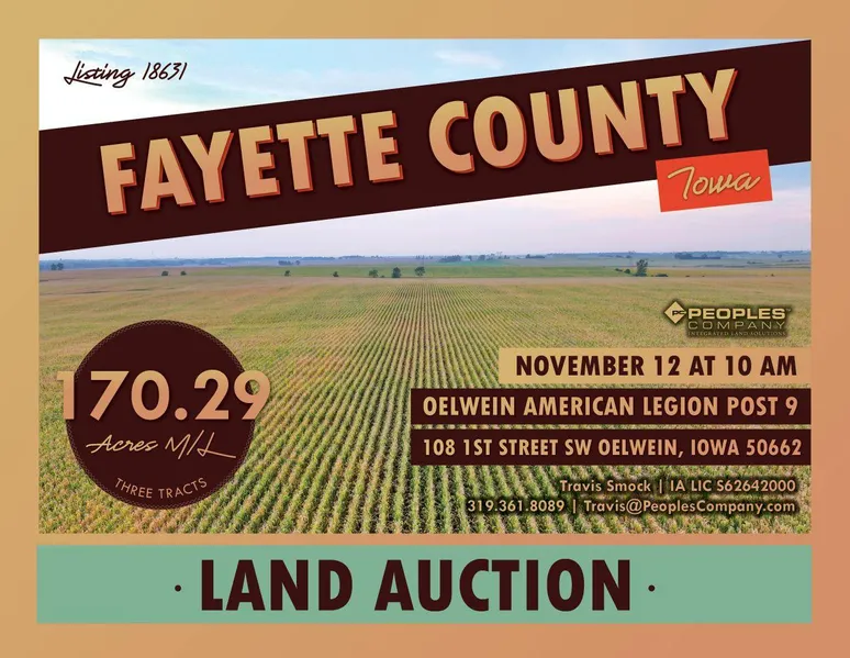 The auction will take place on Wednesday, November 12th, at 10:00 AM at the American Legion in Oelwein, and the property will be sold through the "Buyers' Choice Auction Method," as three tracts on a price-per-acre basis. Tracts will not be offered in their entirety at the conclusion of the auction. The live auction will be available for viewing and bidding through our mobile bidding app for those who are unable to attend. Don't miss the chance to bid on this land that has not been available to the general public for well over 50 years. The farm is located in Sections 32 and 33 of Jefferson Township, Fayette County, Iowa.