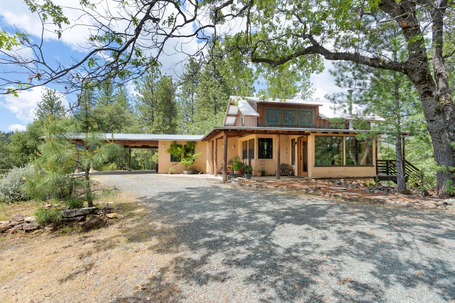Truly a one of a kind home located on a serene 20 view acres off grid w/ 2 backup generators. This straw bale home, exudes character and quality. Many artisans were involved in the construction of this home. They watched the sun rotation, the direction of storms, all to ensure the home was built in the best location. Any portion of the home not made of straw bales, was built from the timber on the property, which was harvested, cut and dried. Ruff wood beams enhance the open concept and vaulted ceiling, large picture window bringing the outside in. French doors lead to the rear deck. Slate floors are throughout, heated by radiant heat floors. The bedrooms and bathrooms are handicap accessible. Extra details: Unique pictures windows, barn doors, Murphy bed, window bed, outbuildings, bocci ball court, 1.5 miles to the town of Volcano, 100% solar owned, and so much more. This home will leav...