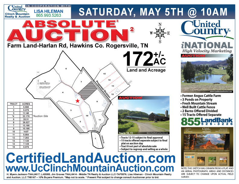 172+/- acres of beautiful farm land in Hawkins County TN. Barns, sheds, silo, ponds, mountain views, and a log home make this picture perfect. Great for an equestrian property or working farm. Woods and wildlife make it a wonderful recreational getaway as well. 172 Acres will be sold at ABSOLUTE AUCTION. Log home and 7 +/- acres will be auctioned same day but are subject to confirmation.
