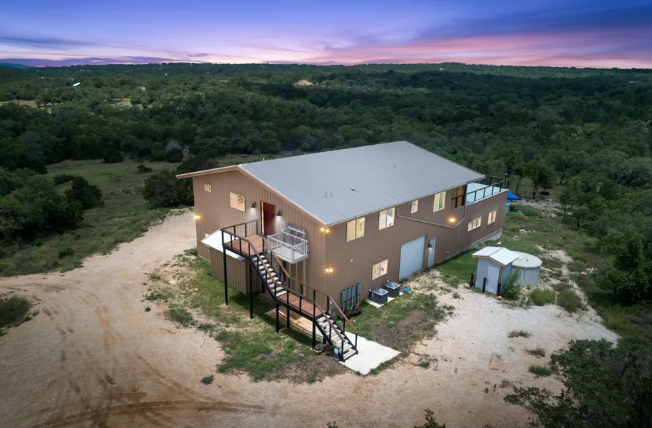 Introducing an exceptional Hill Country Barndominium that seamlessly blends quality construction with versatile living. Spanning over 7,000 square feet, this climate-controlled space is perfect for both comfortable living and income potential. Key Features of this property are: Spacious Layout-The 2,500-square-foot upstairs residence features three bedrooms and 2.5 baths, highlighted by soaring 16-foot ceilings and an open floor plan, ideal for entertaining and daily living. Flexible Use Spaces-The expansive 4,500-square-foot downstairs shop includes dedicated living space with kitchenette potential, perfect for an office, rental, or guest quarters with a full bath. Included in the shop are four 80-amp power drops, and additional 30-amp outlets providing not only ample space but electrical capacity to support a wide range of uses. Energy Efficiency- Built with double-insulated walls, this home ensures comfort and energy savings throughout the year. Outdoor Living-Step outside to a 2000-sq ft balcony patio offering stunning views of the rolling Hill Country, ideal for outdoor gatherings or serene relaxation. Ample Utilities-The property features a strong well and a large cistern for additional water storage. Convenient Location-Located just 60 miles from Fredericksburg,10 minutes from Gruene, 5 miles from the Whitewater Amphitheater and Guadalupe River, with easy access to San Antonio and Austin airports. Privacy and Freedom-Enjoy the ultimate freedom with no city taxes and no HOA, along with ample land for privacy and outdoor activities. This barndominium is designed for those seeking a unique living experience with endless possibilities, perfect for families, hobbyists, or investors. Dont miss out on this remarkable opportunity!