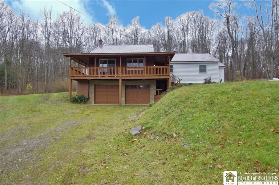 A very peaceful, private setting. Nestled on nearly 9 mostly wooded acres with trails to peruse. Great hunting! The home features a sprawling living room with wood stove. This spacious room can host loads of people for those who love to entertain or host the holiday gatherings. Sliding doors from the living room lead to the covered front porch where you can sit and enjoy the view and sounds of nature. The room off the living room served as the primary bedroom. This room has sliding doors that lead to the rear covered patio and access to the wooded acreage. The kitchen comes fully equipped with appliances, including dishwasher, and has a convenient eat-in area. The cook in the home will love the ample counter and cabinet space. There is first floor laundry room, additional two bedrooms and the common bath. The garage has electric doors and shop space. The home is heated with propane, maintenance free metal roof, decking(from previous pool) and is located in the Frewsburg School District.