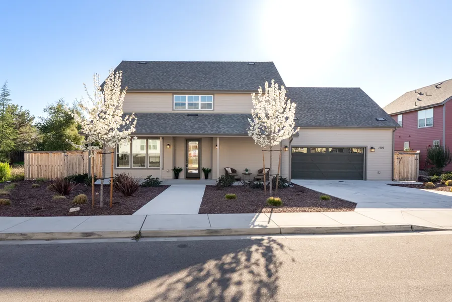 Experience modern luxury in this stunning Atascadero home, built in 2022 and thoughtfully designed for style and functionality. The 2,578± sq. ft. main residence features an open-concept layout with abundant natural light, sleek finishes, and seamless indoor-outdoor flow. The contemporary kitchen boasts quartz countertops, a spacious peninsula, stainless steel appliances, and a walk-in pantry, creating the perfect space for entertaining. Upstairs, vaulted ceilings enhance the airy feel of the home, which includes 4 bedrooms and 3.5 bathrooms. The primary suite is a private retreat with dual vanity sinks, a soaking tub, and a tiled shower. A second bedroom suite offers a walk-in closet and ensuite bath, while two additional guest rooms share access to a well-appointed bathroom. A convenient laundry room is located on the main floor for added ease. A detached 700± sq. ft. ADU features 2 bedrooms, a bathroom, and a dedicated laundry area—ideal for guests, extended family, or a private office. The landscaped front and back patios provide inviting outdoor spaces, while additional amenities include a tankless water heater, ample storage, and a two-car garage. This exceptional property blends modern design with everyday comfort in a prime Atascadero location.
