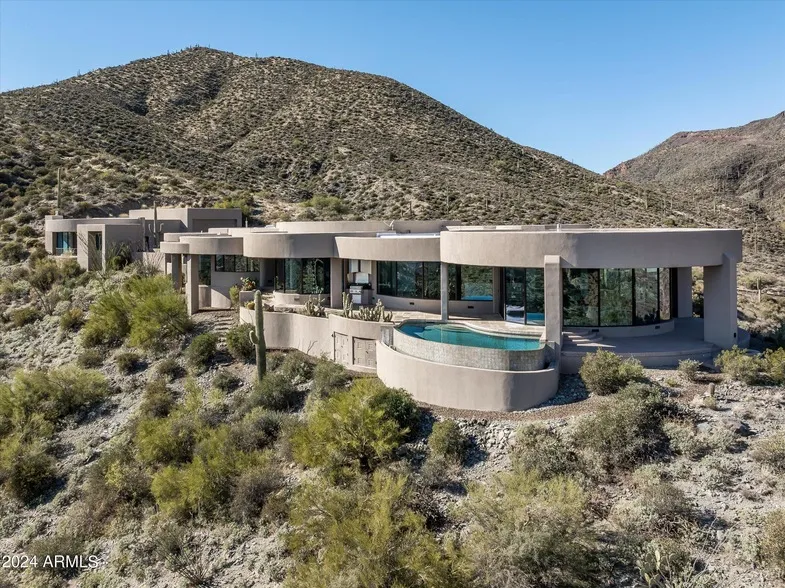 Stunning contemporary elevated hillside estate home with outstanding Valley and mountain surround views from every room, on 18 acres in gated community of Carefree Ranch Homesteads. Private electronic gate opens to a long level driveway with a 62' turnaround and extra parking for easy maneuvering into a double-sized RV garage. Wet bar with full size refrigerator. two dishwashers, disposal and large wine chiller. Theater and sound system with state of thee art electronics and ten foot screen. Dining room has a built in lazy susan table for 8, with warming drawer and buffet. Kitchen includes two dishwashers and a warming drawer. Spacious complete guest house with great views, living room and full-size kitchen appliances including washer/dryer. Motor shades, inside and out, Lutron lighting. Floor to ceiling windows provide xpansive views with North, South and East exposures. There are a fe...