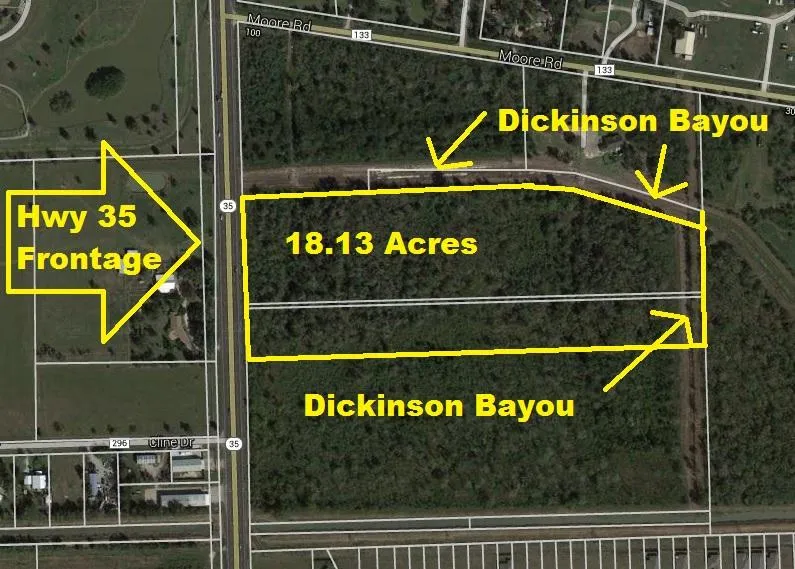 New Price! 18+ Acre Bayou Front Property w/538 ft of Hwy 35 Frontage. Close to Brazoria Co. Parks like Resoft Co. Park - 80 acres w/5 pavilions, soccer fields, basketball courts, fishing pond w/piers, restrooms, large multi-stage Playground & volleyball pit. Also close to Galveston Co. Parks like Friendswood Sport Park - 27 acre sports park w/softball fields, soccer fields, concession stand & restrooms. Quick commute to Galveston Beach, Houston Downtown & TX Medical Center via Hwy 35, I-45 & TX-288. Property is in Alvin City Limits.