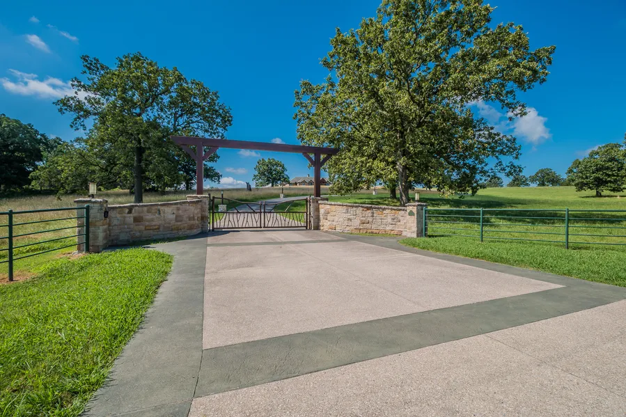 Your own private resort in the Ozarks awaits! A gated, tree-lined driveway provides a graceful approach to the impressive limestone estate nestled on almost 20 acres of rolling hills, pastures, and mountain views. This artistically crafted estate is perfectly integrated into its natural environment. Interior finishes include slate stone flooring, gorgeous solid wood truss beam ceilings, custom designed chandeliers, solid wood doors, and floor to ceiling picture windows framing the incredible property views. The beautiful 10,000 square foot home offers 2 levels of thoughtful living space featuring 5 en suite bedrooms, 7.5 baths, spectacular gourmet kitchen with catering prep space, handsome study, recreation space with a 2nd full kitchen, billiard area, and a home theater. Retreat to the Owner's Suite at the end of the day and relax in front of the fireplace, or the luxurious bath with its own private spa. Other amenities include an elevator, advanced Savant smart home technology, Geothermal system, copper guttering, Pella windows, 2 full laundry rooms, and generous cabinetry and closets. The impressive outdoor living areas include multiple covered verandas, a hot tub/fire pit patio, and an inviting beach entry pool featuring waterfalls, an underground 360-degree loop slide, grotto, and a diving platform. The property also features 8 garage spaces; climate control spaces include attached 4-car plus oversized detached 3-car with half bath and upstairs 718 square foot guest house. This rare offering will not disappoint.