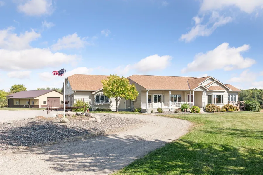 The Best In Country Living is found here!Amazing opportunity for one of a kind, rural property to be yours. This quality built 3 bedroom, 3 bath one story home boasts views of rolling fields, wetland & woods beyond. An endless list of fine features include main floor primary bedroom suite with large walk-in closet, double vanity, separate shower & Jacuzzi tub. Main floor laundry, lovely 4 season porch with vaulted ceiling-adjacent to 8 x 14 deck. Heated floors, 36" paneled doors and much much more. A light filled lower level has a 3rd bedroom, 3/4 bath and an enormous great room/family room. The 34 x 30 garage has heated floors & a 30 x 14 bonus room above. A perfect spot for the home office. The 40 x 56 outbuilding will WOW you. Ready for hook up to in-floor heat. The large overhead doors can accommodate a large motor home or whatever else you might own. Approximately 14 acres are tillable. Currently in beans and alfalfa. City of Greenfield says that this rural residential parcel can have up to 18 whole animal units. Don't miss seeing this lovely property !