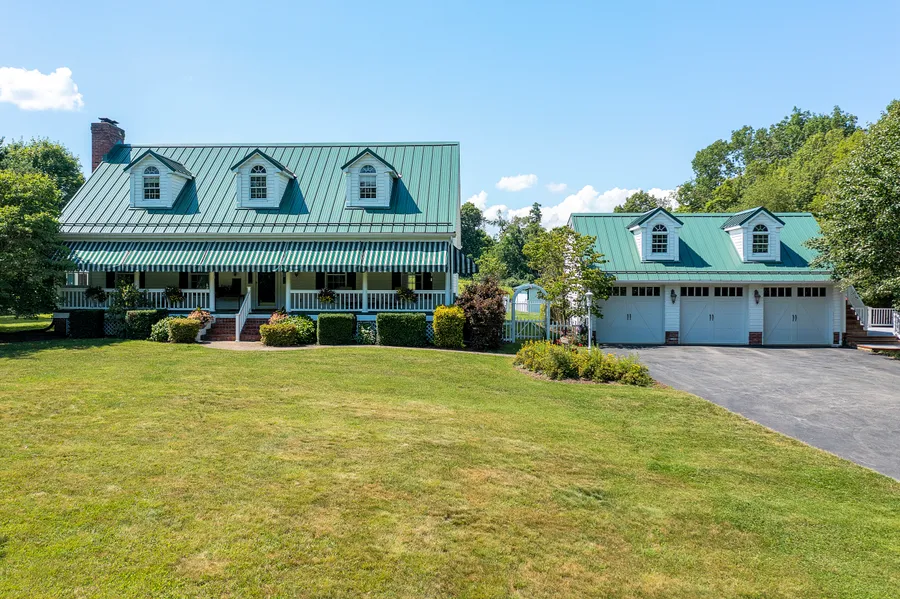 Such happiness in this beautiful home reminiscent of Currier and Ives! Enjoy 18.6 absolutely gorgeous acres complete with a 36x40 Barn, Green House and Garden, white picket fenced in back yard complete with purple Hydrangea bushes, resort-style 16x32 in-ground pool, plus a 3 car detached garage complete with a 33x13 second floor. The tree-lined private driveway opens to a spectacular lush green lawn, a beautiful Cape Code home with a 24x24 covered front porch perfect for greeting guests, family, or just relaxing. Detailed moldings, Wainscoting on walls and ceilings, beamed ceilings, and rich hardwood flooring in entry, family room, dining room, and kitchen. Lovely country kitchen with walls of floor-to-ceiling windows, island, subway tile backsplash, farm sink, and white cabinetry. The living room has new carpet and a beautiful wood burning fireplace. Master suite with a vaulted ceiling,...