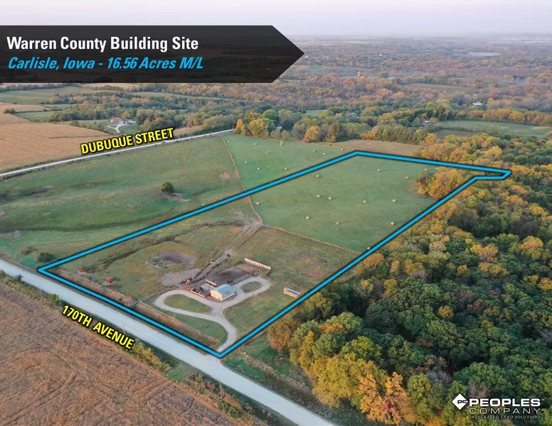 Research Parcel InformationFrom the intersection of Highway 5 and Scotch Ridge Road in Carlisle, Iowa head southeast on Highway 5 for 3/4 of a mile until you reach 165th Place then turn right (south). Proceed south on 165th Place for approximately 1.5 miles until you reach Clark Street. Turn left (east) on Clark Street and proceed around the curve, where the pavement ends Clark Street transitions to 170th Avenue. Continue straight on the gravel for 3/4 of a mile, look for Peoples Company signage.