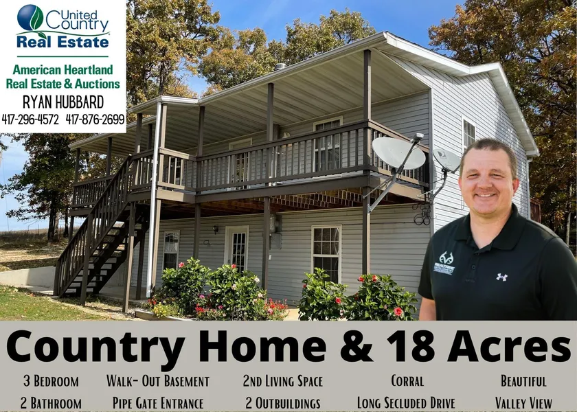 The Country Lane that Takes You Home. Through a pipe gate entrance, down a timbered private lane is the secluded country home you have been waiting for. This St. Clair County Missouri home rests on 18 acres and overlooks a remote valley with the perfect mix of pasture and trees. The property has 2 ponds and is perimeter fenced and divided into 2 paddocks. The farm includes a 24x30 shop with a concrete floor and a tool shed. The 3 bed, 2 bath raised ranch home boasts over 2100 total square feet which includes the full walk-out basement. The open concept floor plan upstairs features an oversized kitchen and eating area and large living room. The master bedroom and bathroom and the utility room are also upstairs and new vinyl plank flooring throughout. In the basement, a second living room features a woodburning stove, and a door to the patio behind the home. The 2nd and 3rd bedrooms are also downstairs as well as an oversized full bathroom. A peaceful country view all of your own can be seen from every window in the home. A new deck dresses the east facing front of the home and a stunning deck off the kitchen in the back of the home provides amazing view of your property to the west. A home and small acreage like this is difficult to find in the current market, so call quickly to schedule your showing on this beautiful country home.