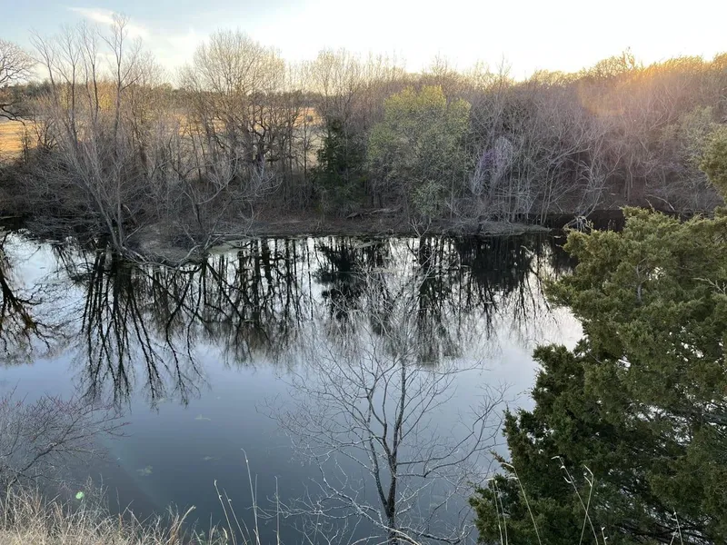 Variety of mature Oak trees and native trees with Pecans bordering the hay field.