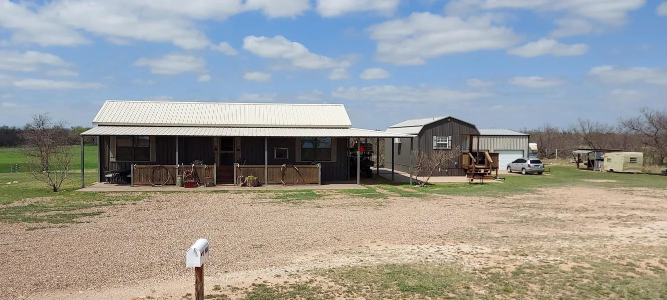 Calm peace and quiet is offered in 2 Separate Living Spaces sitting on 1.2 +/- acres approx. midway between Quanah and Paducah . The Larger Quarters with 756 square feet (per CCAD) features living area, full kitchen, washer/dryer, and 2 bedrooms, each with their own 3/4 bath. Covered porch areas, and carport on 3 sides. The Smaller Quarters with 411 square feet (per CCAD) has a living area, full kitchen, 1 bedroom with a 3/4 bath and Covered porch in front. All appliances included in both. Warm wood walls and vaulted ceilings give both a cabin feel. Large windows allow loads of natural light. The Large Metal Barn has 2 OH doors and a shop/storage area. 3 RV Hook-Ups and a bonus covered shed add to the appeal. The Beautiful Landscaping provides a sense of home to the wide open views.