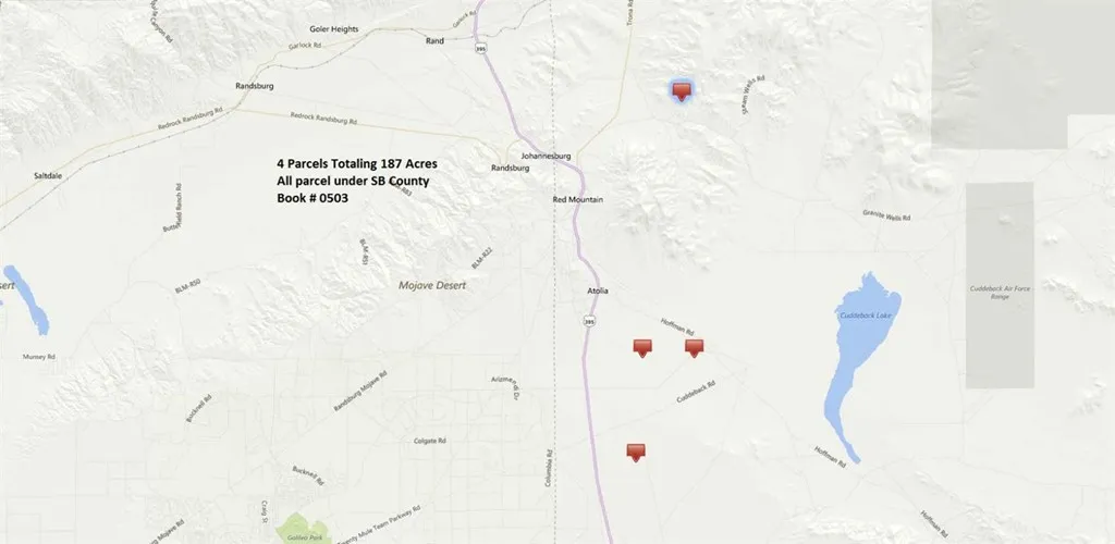 *** Come VIEW and MAKE an OFFER TODAY ! Amazing land opportunity near Kramer Junction CA. Four parcels as a bundle totaling nearly 187 acres, under county book number 0503. See APNs:0503-041-25, 0503-111-24, 0503-241-06, & 0503-121-33. Perfect locations for your own personal ranch or recreation areas. Also, the SB County Desert region is an ideal location for solar/wind power generation. By 2020 CA renewable energy standards will require retail sellers of electricity to produce at least 33% of their power load from renewable sources. This will cause demand to increase for plots of land located in the SB County Desert region. Not to mention mineral possibilities as county mineral classification reports have detailed deposits all over Northern San Bernardino county. Seller willing to carry with easy terms: 33% down 7% amortization over 30 years due in 10, 50% down 5% amortization over 30 years due in 10, 67% down 3% amortization over 30 years due in 10. This is a must see opportunity before it's too late. ***