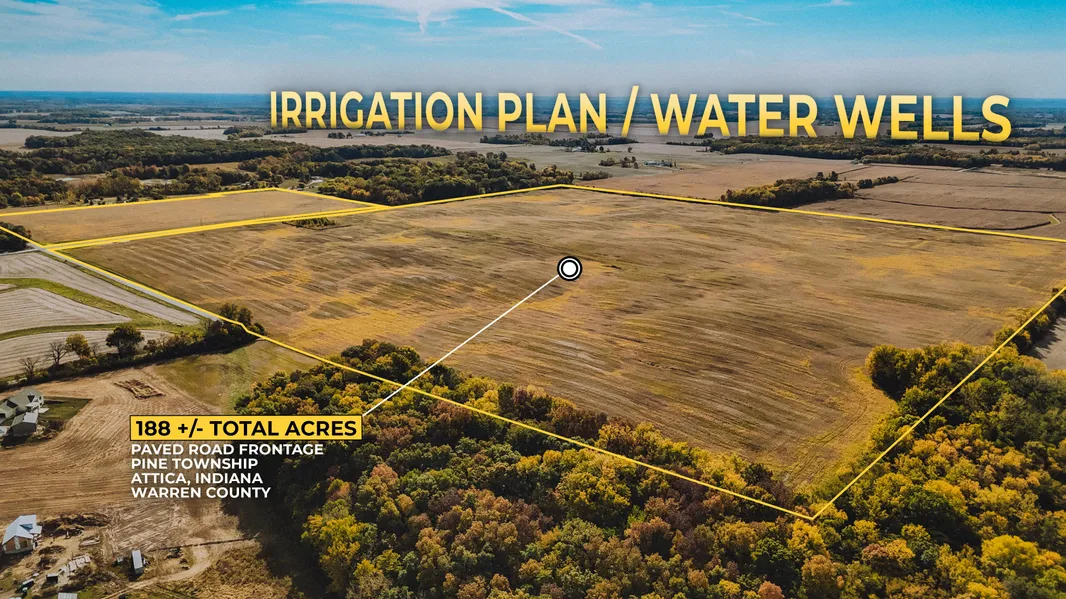 Turnkey 188 acre Warren County, Indiana farm featuring pattern tile with 14" main, irrigation wells and center pivot-ready irrigation plan, strong 137.9 WAPI soils.