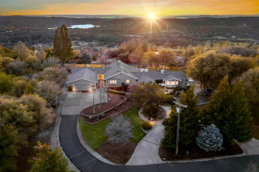 This exceptional and well cared for property offers panoramic views of Lake Wildwood coast and valley Plus unforgettable sunsets. If you are looking for a peaceful retreat or a place to entertain, it been found. Home features 3 bedrooms/4 full bathrooms, perfect for family living or hosting guests. Enjoy the formal Living Rom and a conversation/formal dining area with floor to ceiling stone fireplace. The large family room with fireplace is a perfect spot for fun with wet bar and build-in beverage frig and still large enough for a pool table. Spacious Master bedroom with walk in closet and fireplace with adjoining bath with separate shower, double sinks and jetted tub plus another closet. A second en suite with private bath and patio for guests plus the 3rd bedroom being used as an office. The property boasts 5 spacious patios, outdoor kitchen for summer BBQ's and a relaxing spa. You cn enjoy the incredible views and fresh air every day. There is a detached garage providing extra space for cars, barn, ADU?. This property sits on 10 level acres featuring a 2+ shared lake with plenty of Bass and dock. All useable with an 4 Ac area for horses, goats, barn, arena? 2 wells, 2 septics, RV area.