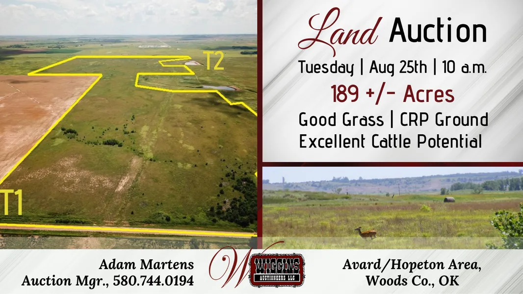 Tract #1: 61 +/- ac. located from Avard, 2 mi. E. to the NW corner OR from Hopeton, 1 mi. N., 5 mi. W., then 1 mi. S. and then mi. east to the NW corner. A good mixture of native grasses along w/many years of CRP create a good cover across the property. Tract #2: 128 +/- ac. directly S. of Tract #1 located in the same section. This property also has a mixture of native grasses w/good growth due to many years in the CRP program. F.S.A. Info for Entirety: According to the Woods Co. F.S.A., there are 188.7 designated ac. of CRP w/a payment rate of $46.16 per ac. or an $8,710 annual contract payment. The contract period for the CRP payment is from 10/1/2010 to 9/30/2020. The principle soil types on the property are Tillman silty clay loam, Class II; Vernon clay loam & Devol fine sandy loam, both Class III; & Devol loamy sand & Vernon-Knoco complex, Class IV. General Statements: Order of Auction: Tracts #1 & #2 will be offered separately and together. Legal: 189 +/- ac in the W/2 31-26N-14W, Woods Co., OK Minerals: Do not sell. Possession: upon payment in full of purchase price & transfer of title, at closing, subject to the CRP contract which the buyer agrees to assume and complete. Buyer will be solely responsible for any penalties or pay back for failing to complete the contract. 2019 Taxes: were approx. $468.00. The 2020 taxes will be prorated to closing. Registration: All bidders are required to register with valid form of ID and acknowledge and agree to auction terms & conditions. Absentee bidders who wish to authorize another person to bid/purchase on their behalf, please provide a letter of authorization. Contact the Auction Company for details. Terms: 10% of the purchase price is to be placed in escrow day of auction with the balance being due upon delivery of merchantable title. All information is taken from sources believed to be reliable; however, no guarantee is made by the auction company or its employer. Buyers should satisfy themselves as to acreage, crop base, condition, etc. prior to auction day. Announcements made day of auction take precedence.