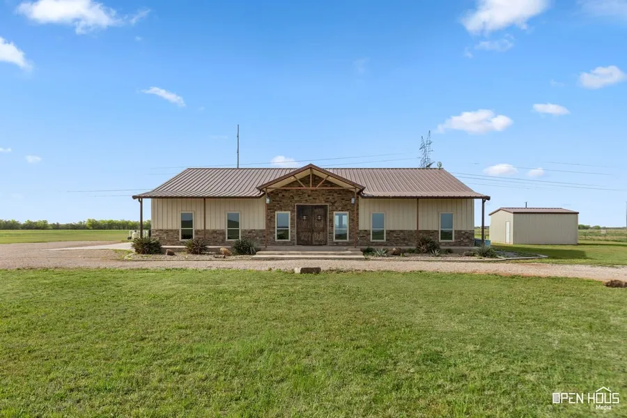 Great home located in Holliday ISD on 6.14 Acres. It’s a metal house with open concept floor plan, 3 bedrooms, 3 baths and 1 half bath. The house features granite counter tops, recessed lighting, tall ceilings, utility room, mud room, storm room, oversized garage, Generac Generator, paid off solar panels, large covered patio, in ground salt water pool, outdoor kitchen, fenced in back yard, with a separate fenced area for pets and a shop.