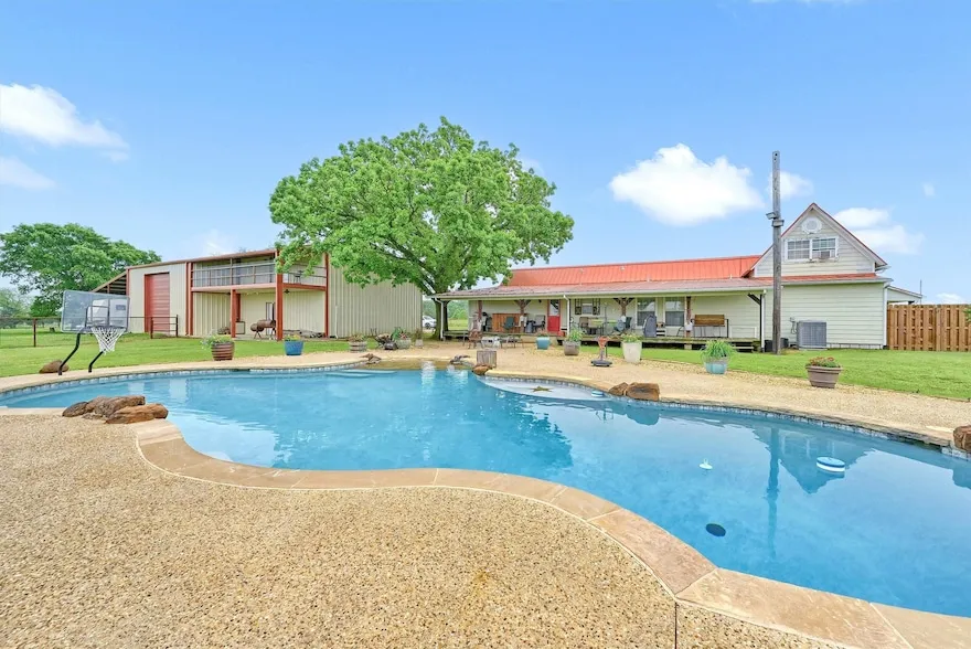 Welcome to this rare 19.2-acre estate where timeless charm meets modern comfort. Nestled amidst a perfect blend of open pasture and mature woods, this property offers privacy, beauty, and abundant wildlife including deer and hogs, ideal for nature lovers and outdoor enthusiasts. The centerpiece is a beautifully expanded home that retains part of its original 1900 structure, seamlessly combined with a thoughtfully designed, upgraded addition. Inside, enjoy the warmth of historic details alongside modern amenities. Step out front to take in breathtaking sunsets from the wide porch or relax poolside while the sky turns gold. The land has towering, mature pecan trees and offers plenty of space for horses, cattle, or simply to enjoy as your own personal retreat. A standout feature is the 60' x 40' insulated metal building, complete with a lofted game room and a balcony overlooking the pool, perfect for entertaining family and friends. Whether you're seeking a serene homestead, a weekend getaway, or a unique event property, this special place offers endless possibilities.