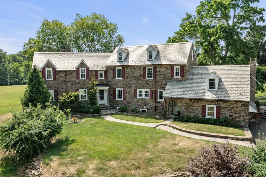 Welcome to Creeks Bend Farm, a private bucolic oasis. The long private driveway leads to a charming bridge over the Park Creek and on to a charming custom-built stone home. A gracious foyer opens to a spacious living room with beamed 10' high ceilings, stone fireplace, and deep window sills and a lovely Dining Room. The country kitchen leads to flagstone breakfast room with magnificent views of the fields. The family room again has surprisingly high ceilings and a fireplace. A main floor in-law suite with living room, bedroom, and full bath complete the main level. A stone patio and porch add to the entertaining space. The elegant main stair leads to a spacious en suite bedroom with renovated bath and three other comfortable, charming bedrooms, a renovated bath, and a finished attic space. A second convenient stair leads down to the kitchen. The pool area includes plenty of private lounging space and a casita. Other outbuildings include a 3-car oversized garage and 5-stall horse barn and tack room. Historically the property has been home to horses with easy pasture land as well as many a family celebration and community events. Explore the natural beauty of the quiet creek, fields, and woods. Sellers have explored subdivision possibilities and possess engineering plan for an eight lot subdivision. Easy access to Rt 309, 34 minutes to Philadelphia.