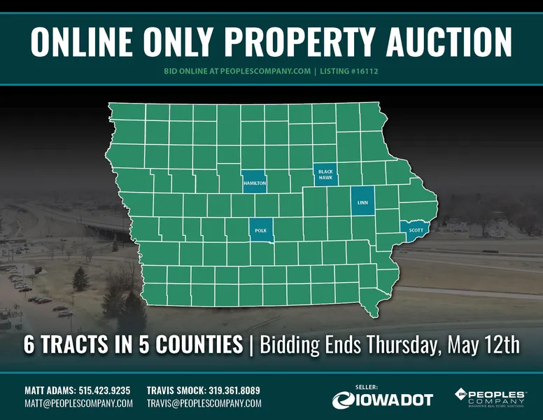 Peoples Company is handling the sale of six properties owned by The Iowa Department of Transportation through their Online Auction Service. Properties are located in Hamilton, Polk, Black Hawk, Linn and Scott Counties. Properties included in the auction consist of various types of land.