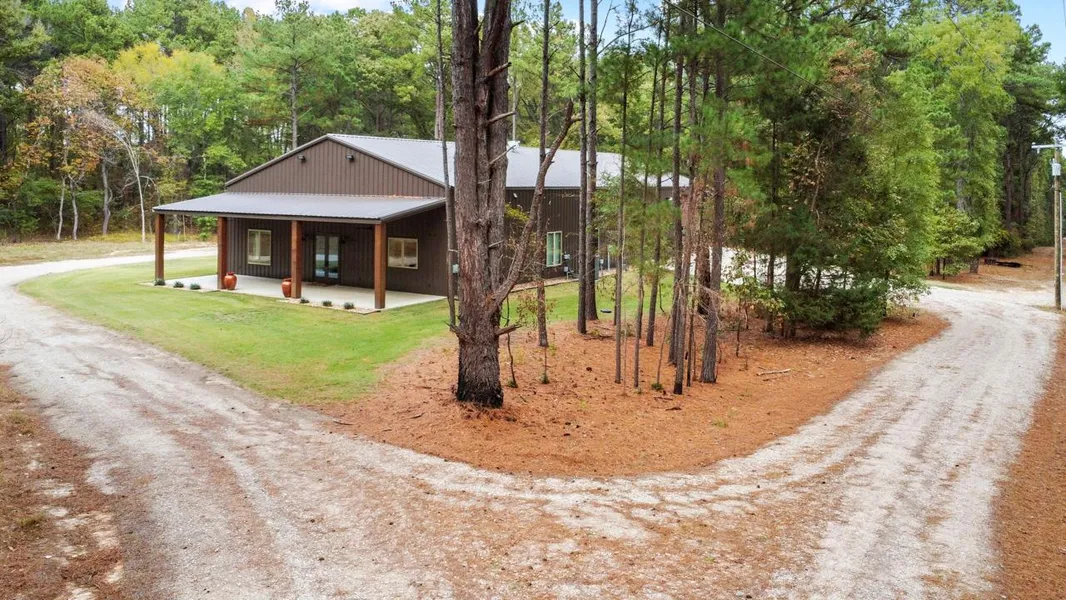 Secluded acreage with barndominium near Lake Palestine & Eagle's Bluff! Situated in a clearing, this 2500 sf home has tall ceilings, beautiful finishes inside and is connected to a 2500 sf workshop. Open kitchen and dining are ideal for entertaining. Kitchen features an oversized island with storage and seating, tons of workspace, gas range, farmhouse sink, and great storage. Master has en suite bath and large walk-in closet. Two guest rooms share a hall bath. Office space with built-in workspace and storage. Workshop has 14' doors to easily store your RV. Doors on either side allow you to pull through without having to back in. This one-of-a-kind property is a must see!