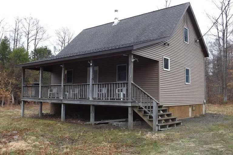 Cozy cabin with 2 bedrooms and a large loft with skylights, hickory cabinets, full bath, baseboard electric heat and wood stove, drilled well and sandmound septic, wood shed, nearly 20 mostly wooded acres adjoining State Game Lands 66, fruit trees. Large porch to watch the bears, deer and turkeys.