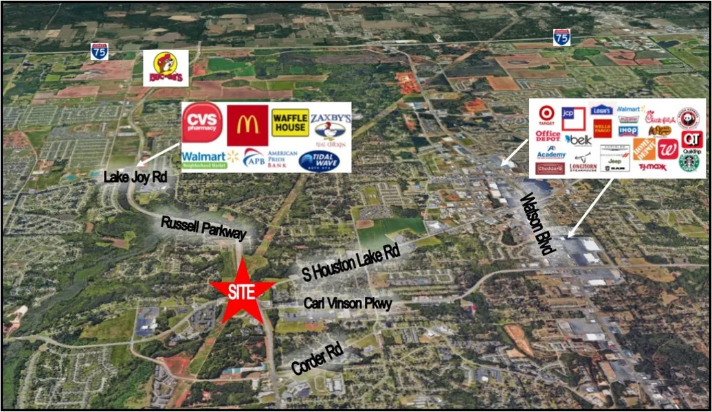 · Very visible corner property fronting Russell Parkway & S Houston Lake Road