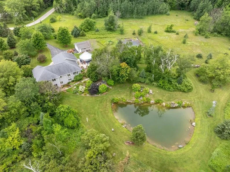 This custom built home is set on a 20 acre wooded lot. Featuring 2,992 sq. ft. of living space. The natural landscaping has a 70 ft. x 100 ft. spring fed pond with the Niagara Escarpment wall flanking the custom built waterfall. If you love nature or an avid deer hunter, this property offers view of birds and wildlife from the home and the deer stands. The home includes 3 bedrooms, 2.5 bath rooms and a finished lower level. Built in 2002, this home has timeless finishes and design. Gas fireplace in the living room. Also includes a Grain Bin Gazebo. Ready for your outdoor cookouts. Inside is a lap pool for your everyday exercise. Also includes a detached garage to include 3 more parking spaces. Enjoy the quiet solitude of this home.