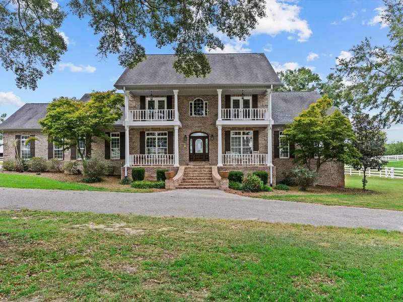 This residence boasts 5,079 sf and is positioned on multiple parcels consisting of 19 acres MOL, conveniently located just two miles south of the Enterprise bypass and is a horse lover's dream with a turnkey breeding, boarding, training, or pleasure riding facility. The property features a 2-car garage with two storage/tool rooms. There is a mudroom with custom cabinets, an industrial sink, washer and dryer hookups, four custom cubbies, and a storage closet. The large entryway includes an oversized coat closet. This residence also features a large office, dining room, granite countertops, and stainless-steel appliances (new refrigerator and dishwasher were installed in 2023). Multiple built-in cabinets, bookshelves, and china cabinets offer ample storage. Noteworthy amenities include gas fireplaces in both the family room and primary bedroom, an air jet tub in the primary bathroom, and a spacious walk-in shower. Enjoy the convenience of twin balconies, a 60-ft covered upper deck, and a 30-ft lower sun deck. The saltwater pool boasts a slide and diving board, complemented by an open-air outdoor pool cabana equipped with a TV and outdoor kitchen hook-ups. A stone firepit off the pool enhances outdoor entertainment. The interior is adorned with hardwood and tile flooring throughout. Upstairs, youll find a sitting/craft room; a bonus room over the garage, and a large walk-in attic for additional storage space. There is an 800-sf partially finished basement featuring plumbing for a full bathroom and complete power access, with convenient access to the pool area. The man cave encompasses 400 sf featuring built-in custom cabinets and a gun cabinet. Water supply is sourced from a 400-ft well with a 265-ft deep pump, supported by a Culligan filtration system at the well head. County water available, but not connected. The property is adorned with 15 mature pecan trees, adding to its charm and ambiance. The equestrian facility is setup and is suitable for breeding, boarding, training, or recreational riding, the primary horse barn, measuring 45x54, features 5 stalls, an air-conditioned office and tack room, a feed room, hot water heater, refrigerator, indoor wash rack with an industrial sink, an outdoor wash rack, and a reverse power system for generator connection during adverse weather conditions, enabling the barn, well pump, and RV hook ups to operate. Additionally, a 45x54 bonus barn provides 2 stalls, equipped with power, lighting, and indoor/outdoor storage space. A 40x60 pole shed with LED lights and 30 amp/110 power hook ups further complements the facility. An enclosed, covered, and illuminated riding arena enhances the amenities. The property includes 5 pastures spanning approximately 14 acres, each has access to a water source. A spacious open pasture with level terrain for riding purposes is also available.