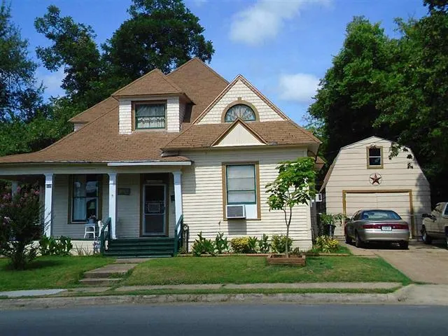 Historic home built in early 1900's with wrap around porch and lots of updates. New electrical and gas lines to house, fresh paint, laminate flooring, water heater, dishwasher, disposal, some plumbing fixtures. Two living areas, beautiful focal point fireplace, lots of wood molding, French doors, attic access includes full staircase that could easily convert in to 2nd story. Outside features a small metal storage building and large workshop with electric and gas. Covered patio. Large corner lot.