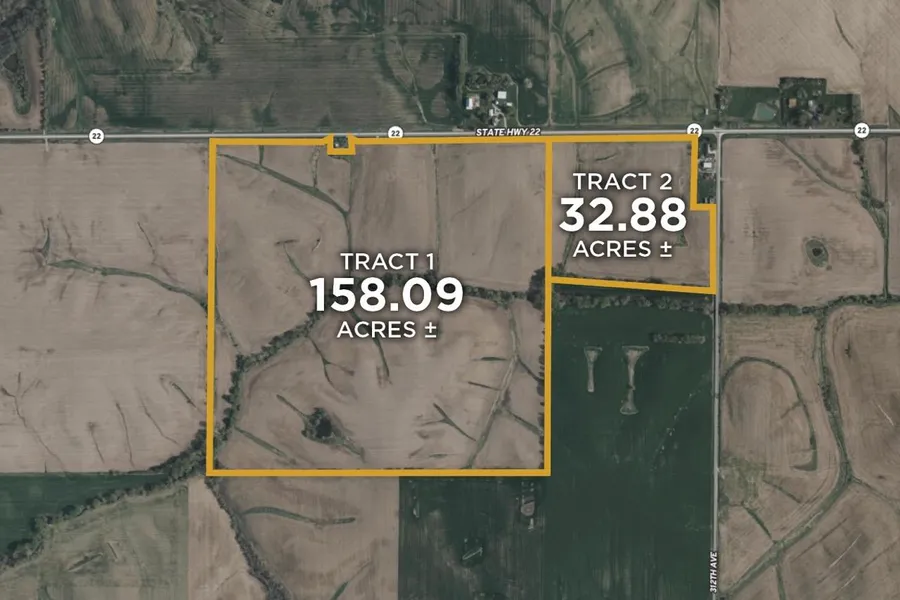 The farm consists of 170.5 FSA cropland acres carrying an average CSR2 of 55.9. Primary soil types include Olmitz-Zook-Vesser, Gara-Armstrong, and Otley silty clay loam. Access is excellent, with frontage along paved Highway 22 to the north and 312th Avenue to the east. Tenancy has been terminated as of March 1, 2026, and the farm will be sold free and clear for the 2026 crop year, with pos...