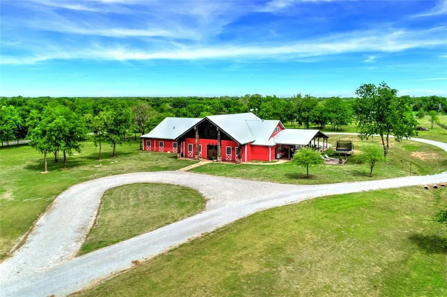 Welcome to your own country escape just minutes from Lake Texoma! This beautiful barndominium was originally a pole barn transformed to a custom retreat home on 10 acres. This home truly has everything you need: huge open living areas, spacious kitchen with full amenities & stainless steel appliances, 4 bedrooms w additional bunk room & 4.5 baths. Your home office doubles as a safe room w fireproof door & hub for sound system wired throughout house. Bonus exercise room & storage room on 2nd floor. Extensive wrap-around porch with outdoor shower, plenty of parking space & beautiful country views! This immaculate property could easily double as a vacation home, VRBO, or AirBnb- you choose! This one is a must see!