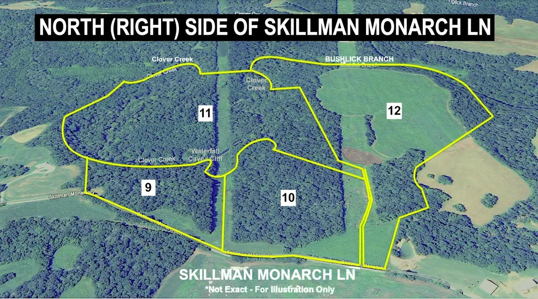Property consists of 194.7 Acres m/l, being the (North) Right Side of Skillman Monarch Lane - A TOTAL WILDLIFE SANCTUARY! Some Cleared, Creeks, some Heavily Wooded Areas with Commercial Timber to be offered separately or in combination. PROPERTY HAS OVER A MILE OF FRONTAGE ON CLOVER CREEK AND ROCK CLIFF FACE THAT IS PERFECT FOR ROCK CLIMBING AND A GEOLOGICAL PHENOMENON FEATURING AN NATURAL WATERFALL OVERHANG AND CAVE ENTRY. A TRUE NATURE LOVERS DELIGHT PERFECT FOR HIKING, CAMPING, HOMESITES, HUNTING AND MORE!