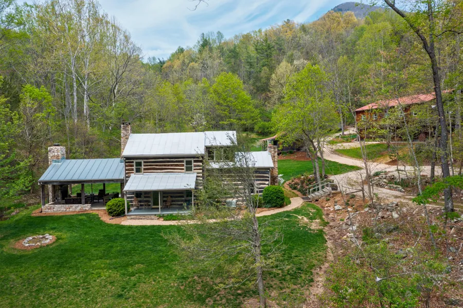 Luxurious 21+ acre mountain retreat privately situated high in the foothills of Hogback Mountain less than 10 miles outside of downtown Lexington, Virginia offers a stunning main log residence and useful accessory buildings including a substantial barn with workshop and living quarters. Combining two early 19th-century hand-hewn log cabins - one original to the site and another thoughtfully relocated from Rockbridge Baths - the main residence features attractive historic character and modern amenity with its open-concept kitchen and living area with exposed log timbers, custom cherry cabinets and counters, reclaimed chestnut oak storage cabinetry, and beautiful variable width pine floors.