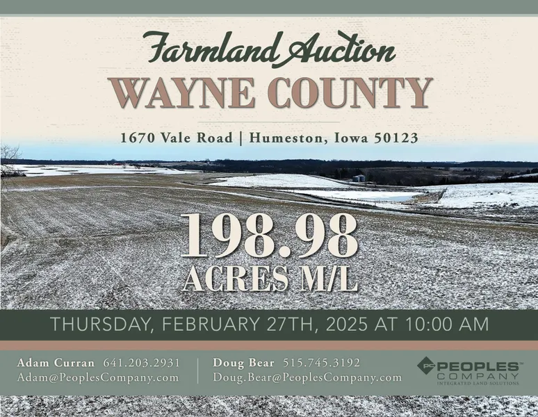 Wayne County, Iowa Farmland Auction on Thursday, February 27th, 2025 at 10:00 AM! Peoples Company is pleased to present a highly improved, combination farmland tract in northwest Wayne County, Iowa. This individual tract, comprised of 198.98 acres m/l located 3.50 miles northeast of Humeston, Iowa, and 2.75 miles southeast of Derby, Iowa, would be a smart investment for a beginning farmer, a buyer looking to diversify their portfolio, or anyone interested in long-term land investment opportunities.