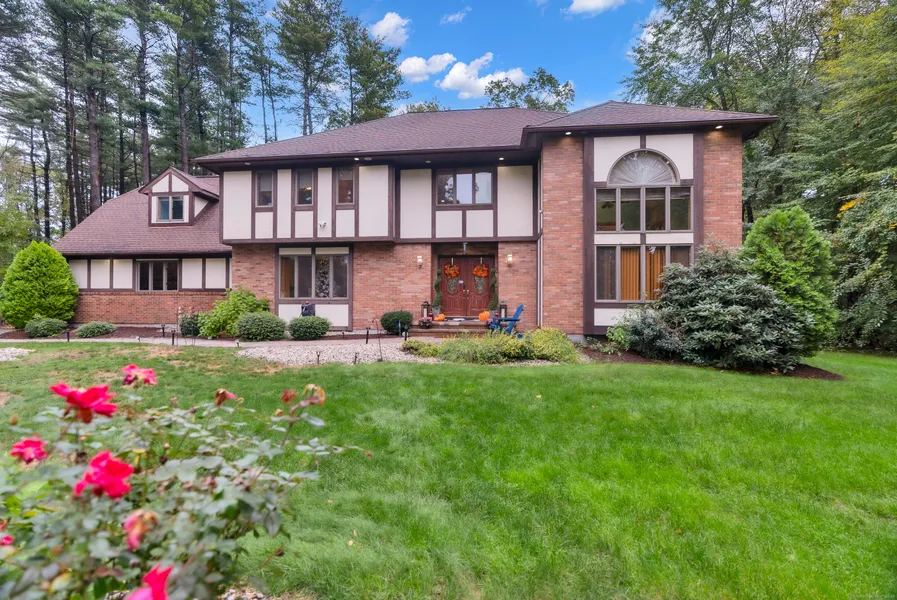 Step inside to experience an elegant blend of classic Tudor charm and modern luxury in South Windsor! Tucked away on a peaceful cul-de-sac within the PHILIP R. SMITH school district, this expansive Tudor-inspired colonial offers tons of living space on over 2 ACRES of land. As you step through the grand two-story foyer, you are greeted by soaring ceilings and rich hardwood floors that flow throughout the main entertaining areas. The formal living and dining rooms flow seamlessly into the kitchen which includes a center island perfect for entertaining. The stepdown family room anchors the home with a cozy fireplace and opens via double patio doors to the sunroom. The first floor also includes a home office or possible main level guest suite, and a full bath. Upstairs, the spacious master suite is a private retreat including a walk-in closet and master bath complete with tub, standing shower with Bluetooth speakers, his and her vanities, and illuminated mirrors. Four additional bedrooms (including a "spare room" that could serve as a sixth bedroom) round out the upper level. Recent upgrades abound, brand NEW FURNACE, freshly installed fence, new ceiling fans throughout, brand new washer & dryer, and expanded side yard. The finished lower level offers extra living space, perfect for a recreation room, home gym, or entertainment area. Could be ideal for multi generational living.