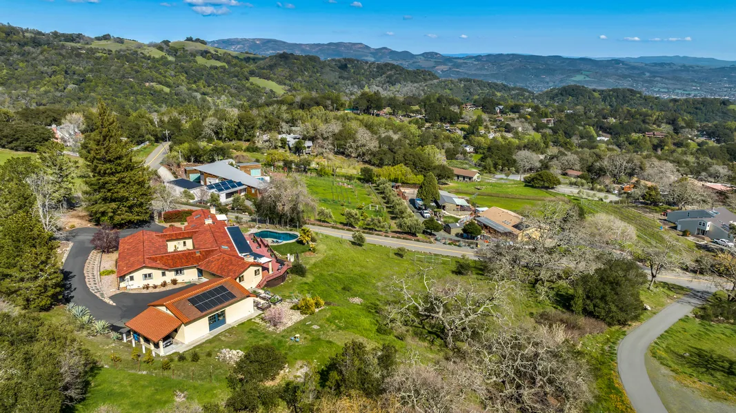 Imagine enjoying a cup of coffee while watching the sunrise and distant hot air balloons, or sipping a glass of wine while looking out over the Sonoma Valley to San Francisco Bay at sunset. Sitting on 2± acres, this Diamond A Ranch estate hints at Spanish style architecture, with its abundant natural light coming from Marvin floor-to-ceiling windows, French doors, and skylights. This Adrian Martinez architect-designed custom single story home offers 3 bedroom and 4.5 bath, with a 3 car detached garage and carport, features impeccable design details and high-end finishes throughout. Garden enthusiasts can enjoy the colorful rose bushes, various citrus, fig trees, and six raised gardening beds. The courtyard and water fountain are perfect for relaxing any time of day. The expansive outdoor deck and pool invite residents to host the perfect BBQ gathering, large or small, while guests take in the views of the town of Sonoma to Mount Diablo. Your 2± acres of space allow quiet and serenity. Solar and battery back-up included. Diamond A residents can enjoy walking or biking the hills and also have the option to join the Diamond A Recreational center to gain access to the recreational pool, event facility, baseball field, tennis and pickleball courts, and horse arena.