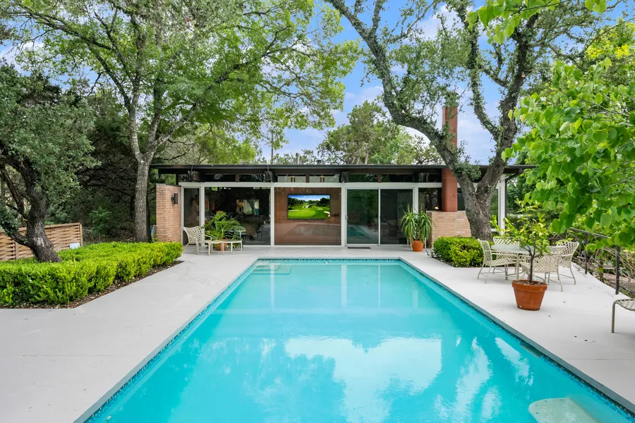 Located in the serene City of Grey Forest, near Helotes, Texas, this remarkable privately gated property is an entertainer's dream. This one-bedroom, one-bathroom 800 square foot home showcases the timeless allure of Mid-Century Modern design. Designed by Milton Ryan, a renowned protege of Frank Lloyd Wright, the house boasts clean lines, abundant natural light, and a sleek interior that captures the essence of this distinctive architectural style. Additionally, the property boasts a rustic guest house with 870 square feet of living space, including one bedroom and one bathroom. The guest house provides a cozy retreat for guests or can be utilized for potential rental opportunities. Situated on 2.02 acres of picturesque land, this property offers breathtaking rolling hill country views. It presents a perfect setting for outdoor gatherings and recreation, featuring a pool for refreshing d...