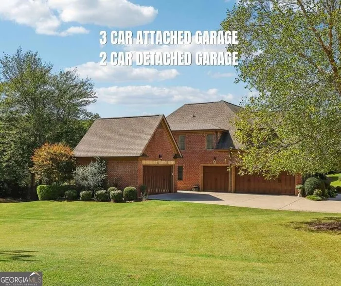 Welcome to this stunning 7,003 sq ft custom estate home situated on 2.03 acres with 5 car garage in a peaceful cul-de-sac. As you drive into the neighborhood you are instantly welcomed by scenic views. The home features 5 bedrooms, 4 full baths, and 2 half baths. The oversized primary suite is located on the main level and has access to your beautiful screened-in deck, offering a peaceful retreat. The primary bathroom is equipped with double vanities, separate tub and shower, and his and her closets. The large eat-in kitchen is complete with granite countertops, a breakfast bar, double ovens, stainless steel appliances, a walk-in pantry, and a cozy keeping room. Step out from the keeping room to enjoy your screened deck, perfect for soaking in the incredible views of your spacious yard and saltwater pool with a hot tub. Upstairs, you will find three bedrooms, including one with an ensuite and two sharing a Jack and Jill bath, plus a bonus room for added flexibility. The finished basement offers plenty of space for entertaining with a home theater, entertainment room, bedroom, plus flex space, a full bath, an amazing second kitchen, and an unfinished gym with a cabana bath for the pool. This home has three total fireplaces, beautiful molding throughout, built-in bookcases, and more details you don't want to miss! Outside, you will find a patio that leads directly to the pool, complete with an outdoor shower. Directly off the kitchen you also have an additional deck that gives you a perfect overview of the property great for grilling. Can't forget the private basketball court that is located in the backyard. There is a 3-car attached garage and a 2-car detached garage with unfinished storage space above. With breathtaking views that sold the current owners, prime location, and just minutes from the Atlanta Falcons training camp, this home is the perfect blend of luxury, comfort, and convenience. Don't miss out on this exceptional property!