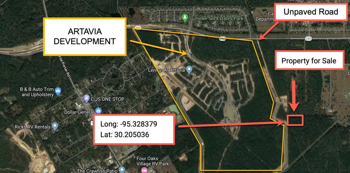 This lot has it all. Deeded Easement Access, lots of space to do what you want or build your vacation or retirement home. ARTAVIA development neighbors the property. Growth movement in the path of the property. NOT located in the flood zone. This property will gives you country feel yet is conveniently located minutes from many landmarks. This property has a formal appraisal of $80k and is being sold for only $69,999! The lot is only 10 miles from Moorehead Blueberry Farm, 30 miles from Lake Conroe, 35 miles from Sam Houston National Park, and 30 miles from Houston.