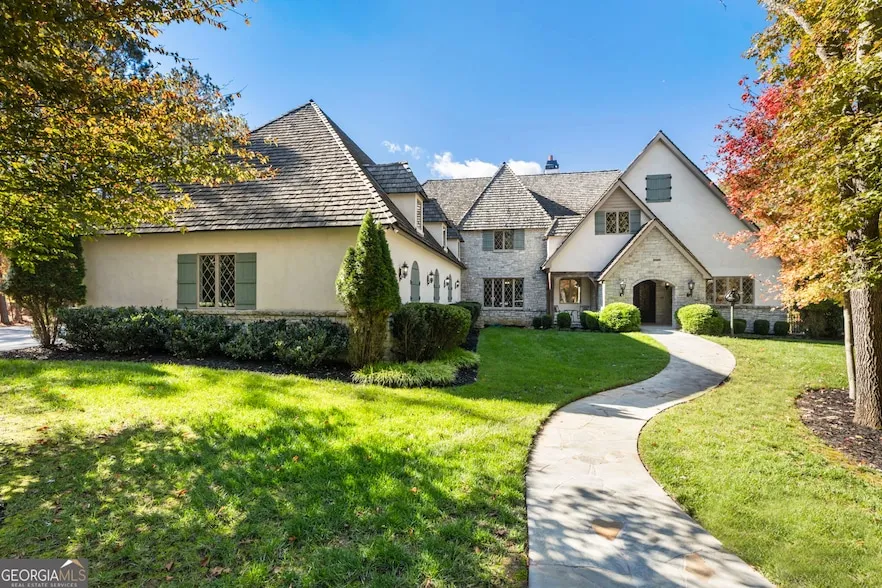 Storybook Country French Manor on Two Acres Welcome to this custom-built Country French manor, completed in 2018 and offered for the first time to market. Perfectly positioned on two private acres just a stone's throw outside of Milton, this timeless residence is one of only five homes on the lake-offering both privacy and prestige in an unmatched setting. Scottsdale Farms, Seven Acre, and Baby Barn Publix are just minutes away, with Crabapple within 15 minutes, and Alpharetta, Avalon, and GA-400 accessible within 25 minutes. The exterior captivates with hand-chiseled stone, stucco, and shake siding, a handcrafted shake roof, and gas lanterns flanking the front entry. The covered and screened rear porch features a built-in grill and a gas line ready for a fire pit, providing a serene space to relax while enjoying views of the surrounding landscape and lake. A 20-zone irrigation system ensures every inch of the lush property remains beautifully maintained. Inside, custom Anderson casement windows fill the home with natural light, while Elm hardwood floors, slate stone in the foyer, and timeless architectural details lend warmth and authenticity throughout. The Great Room's ceiling is crafted from Pecky Cypress, adding texture and distinction. Two wood-burning fireplaces with gas starters-one in the Great Room and one in the Den-create inviting spaces for gathering. The main level offers four en-suite bedrooms, including two luxurious primary suites, each with spa-style baths. The primary bedroom features reclaimed beams sourced from a historic barn in West Virginia. A private study with a secondary workspace nook provides the perfect retreat for reading or productivity. At the heart of the home, the chef's kitchen showcases stained walnut cabinetry and top-of-the-line Wolf, Sub-Zero, and Miele appliances, including a built-in microwave and wine refrigerator in the oversized pantry. Just off the kitchen, a craft room adds flexibility-ideal for creative projects or extra storage. A spacious laundry room with sink completes the main level's thoughtful design. The lower level expands the home's versatility, featuring a fully equipped gym with rubberized flooring, a finished storage room, and a professional woodworking shop designed with comfort and function in mind. The shop includes a full dust collection system at every workstation and a raised plywood panel floor-known as a DryCore subfloor-created to provide anti-fatigue support underfoot. This thoughtful detail ensures hours of comfort while working and also serves as an ideal subfloor should you wish to install hardwoods over the concrete in the future. Car enthusiasts will be delighted by the automotive amenities-an oversized 3-car garage on the main level (30' deep), plus a 4-car terrace-level garage designed to accommodate up to eight vehicles with lifts. Two lifts-one four-post and one two-post-are already in place. A convenient parking pad allows two additional cars to park without blocking the driveway. Built with comfort and accessibility in mind, the home includes spray foam insulation throughout, an elevator, and ADA-compliant wide doorways for seamless mobility. This one-of-a-kind residence combines craftsmanship, comfort, and character in every detail-a true storybook dream brought to life.