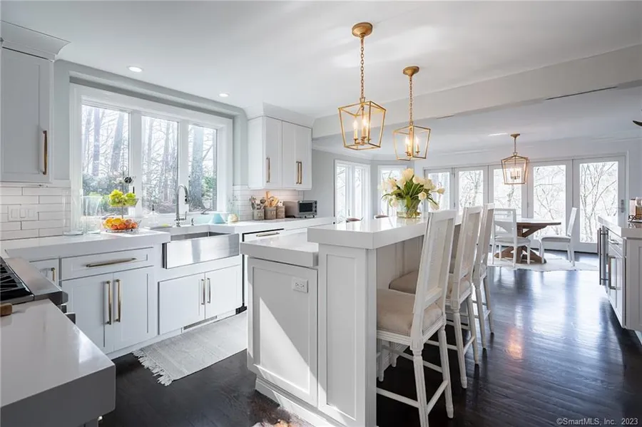 This stunning and newly renovated 4 bedroom and 4.5 bath home is situated on a sprawling 2.5 acres of land. Directly on the Farmington River, this home is surrounded by beautiful river views so you can enjoy watching the foliage change throughout the seasons. The peaceful and relaxing living space features a wall of windows showcasing the breathtaking natural views. The sleek eat-in kitchen is perfect for an at home chef with a six burner gas range, a wine fridge, and stainless steel sink. Additionally, the kitchen boasts a gliding bifold door that opens the wall completely with patio access as it overlooks the scenic riverfront. This home prioritizes style and convenience with a 1st fl laundry and mudroom that has lots of storage space and garage access. The luxurious primary bedroom amazes with bay windows and a walk-in closet; the sparkling en suite bathroom gives an at home spa exper...