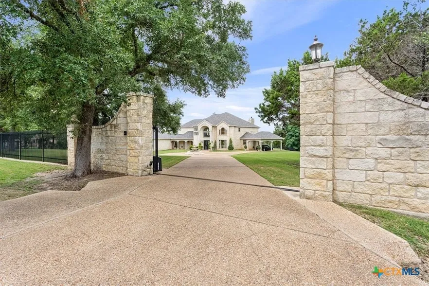Located in Belton, TX near Stillhouse Hollow Lake! Access the property through a mechanized wrought iron gate and pull through the circular drive. You're greeted by incredible features such as the ornate fountain, accented french doors, attached 3 car garage and separate portico as well as a detached 900 sq ft 2 car garage with AC. A new roof and 6 gutters and leaf guard accentuate the exterior. Entering the home you'll find a grand staircase to your left with sconce lighting as you ascend to a terraced balcony. To the right of the entrance you'll find the formal dining. Continuing through the foyer you enter the primary sitting area. Vaulted ceilings and stacked windows provide airiness and natural lighting. The grand fireplace draws your attention around and through to the second sitting area. This space is equipped with a fireplace bookended by built-in shelving. This second sitting area is open concept to the kitchen and prep space. The kitchen features commercial grade appliances including an 8 burner Wolfe range and Cafe french door wall oven and microwave. Other appliances include a Sub Zero refrigerator and Bosch dishwasher. In the butler s pantry there is a KitchenAid ice maker and built-in wine cooler. The master suite offers ample space and balcony access overlooking the lake. In the master bath you'll find a separate soaking tub and oversized walk-in shower with split vanities. Secondary bedrooms offer space for guests, libraries, and offices. Out back, take in views from your balcony or patio as you enjoy the private heated pool and spa or outdoor fireplace. additional features include a 500 gal. propane tank dedicated to a 48 Kv whole house Generac Generator with auto start and cutoff. A separate 250 gal. tank services the kitchen range and fireplaces. The home s AC has a geothermal heat exchanger which cuts down on noise. This home also features a whole house, garage, and detached garage security system. Call today to set up your private showing.