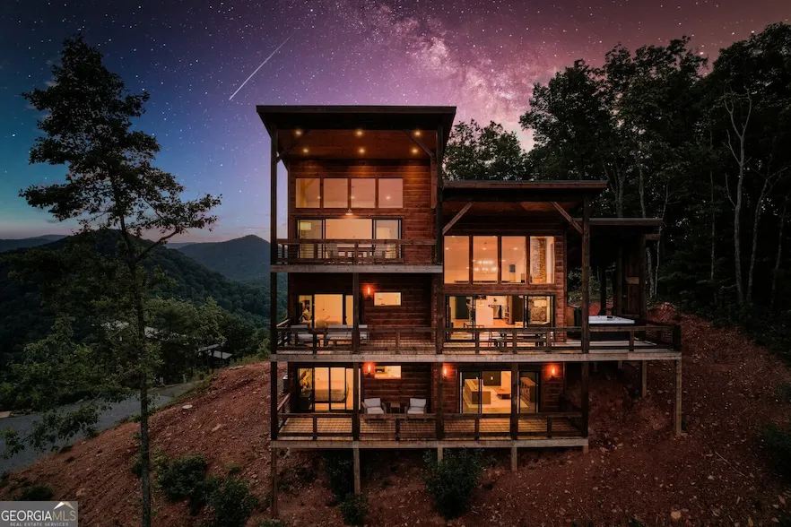 Modern Mountain Living : Welcome to Big Sky Lodge! With some of the best views in the area, this stunning contemporary rustic chalet perches above over ten ranges of layered mountain views in a highly sought-after gated community in the heart of Cashes Valley. The home i s complete w/three levels of indoor and outdoor living. On the main, find a large gourmet kitchen, wall of glass and sliding glass doors, towering stone F/P, large living opening up to a gorgeous wraparound deck, party porch w/ F/P and hot tub, and stunning sunset views. Upstairs is complete with gaming loft, bedroom suite, and large balcony. Terrace level is finished with large den, F/P, and additional sleeping suites. Sold FULLY TURN KEY and with the potential of being a stunning full-time, second home, or one of the top rental destinations in the mountains, it's sure to leave you speechless.