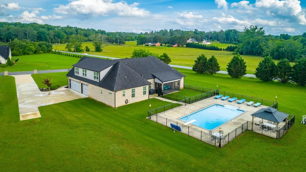Welcome to this stunning all-brick home nestled in a peaceful country setting, offering the perfect blend of elegance, functionality, and comfort. Situated on 2 level acres, the property features a sparkling inground pool with a diving board, generous patio space for entertaining and a shaded gazebo - your private outdoor oasis awaits. Step inside through the beautiful double wood doors into an open-concept floor plan designed for modern living. The inviting living room features a cozy stone fireplace flanked by built-in bookcases, creating a warm and welcoming atmosphere. The dream kitchen is bright, spacious and fully equipped with top-of-the-line appliances, a large kitchen island, coffee bar and ample cabinetry. A walk-in pantry provides all the storage you need and the separate dining room is ideal for hosting family and friends. A dedicated home office on the main floor offers a quiet and productive space - perfect for remote work, homework or managing the household. This home features a smart split-bedroom layout. The luxurious primary suite includes a spacious walk-in closet with custom shelving and a spa-inspired ensuite with double vanities and a magnificent tiled shower. Two additional bedrooms on the opposite side of the home share a well appointed hall bath. Upstairs you will find a versatile bonus room, plus an additional bedroom and full bath--perfect for guests, a teen suite, or a private getaway. Unwind on the screened porch while enjoying peaceful views and stunning sunsets. The 3 car garage provides ample parking and storage for vehicles, tools and outdoor gear. Located just minutes from shopping, dining and the scenic Chickamauga Battlefield, this exceptional home offers the serenity of country living with the convenience of the town nearby. Don's miss this rare opportunity to own a truly special property!