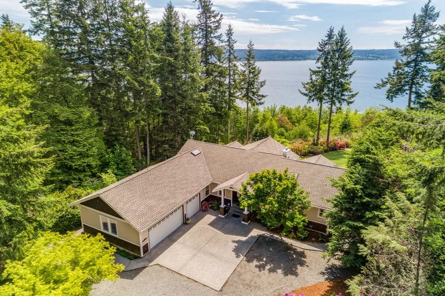 This meticulously maintained home is located on two parcels totaling 3.89 acres, with expansive views of the Hood Canal and Mt Rainier, and 154 of waterfront. Elevated location on high bluff enhances connection with the outdoors, afforded by large windows and sliding glass doors to the deck areas. Surrounded by manicured lawn and mature gardens, privacy and peace are assured! The living space features open design, with easy flow between kitchen, dining and sitting areas. Maple floors have been immaculately cared for (no shoes were allowed!). The well-designed kitchen, with custom hickory cabinets, spacious countertops, a prep sink, pantry, built-in desk. Primary bedroom/bathroom on main, lower living area, 2 additional bedrooms/full bathrooms.