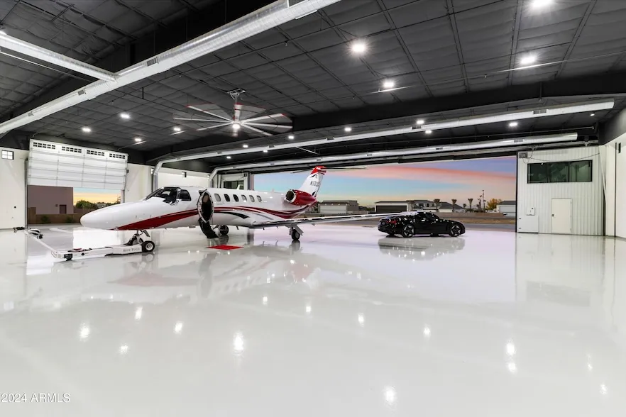 Introducing Misi n Veintid s (Mission Twenty-two). This amazing Pegasus Airpark(5AZ3), Queen Creek, AZ home was inspired by classic Spanish style missionarchitecture. The unique mission style entrance to the home is through a breezewaygate which leads you to a stunning courtyard view of the estate. This estate of 32,000sq ft of luxury living, with an incredible 26,000+ sq ft of conditioned space has 16'' thickwalls for style and maximum efficiency. Perfectly situated on North South double lot,taking a massive 350' of taxiway, sits the main residence on three levels and includesall these features: A 10,000 sq ft steel construction Hangar with Full HVAC, Epoxy coated floor, ''Big Ass''Fan, Pocket style main hangar doors with an 78'x17' clear opening. Flight office, Storage room, Downstairs bathroom, Interior stairs to mezzanine with bar, Upstairs bathroom, Balcony, Two motorized vertical opening 20 ft glass garage style doors facing the courtyard. " A massive courtyard featuring: 2,000 feet of covered breezeways, Multiple swimming pools with fountains and firepots, Covered outdoor full kitchen under a mission style bell tower, Lit Pickle ball/basketball sports court & Putting green, Sand Volleyball court. "The main house has a 5,000 sq ft Basement: bowling alley, 75 ft shooting range, Tiger Woods' (Full Swing Pro 2.0) Golf Simulator, Wine Cellar, Walk-in vault, Storage room, Bathroom, Interior and exterior stairs. " Next is a 2000+ sq ft detached Master Bedroom: Custom his and her walk-in closets, Separate bathrooms and linens, Large walk-in shower & separate tub, Incredible ceiling details with accent lighting, Multiple balconies, Bar, Fireplace, sliding doors. " Master Spanish Garden: with water and fire features. " General Design considerations: 16" double insulated walls which are quieter, more energy efficient and style correct as seen in the deep-set windows and doors, The extensive iron work is amazing, Custom railing with HH monogram, windows with iron details. " Don't miss these details: clear view elevator from basement to second story sized for wheelchair access. " Wired Cameras access from internet. " Automated lighting. " Security System " Hidden AV closet " Luxury full-service guest suites with spa like bathrooms, suites include laundry and bar in each " 2834 sq ft 2nd Story with Gym, spa and sauna, gym bathrooms & laundry. " Large outdoor balcony, firepit, incredible views of the Superstition and San Tan mountains " Balcony sliding windows overlooking the courtyard. " Firepole slide down from gym to first floor hidden door " Formal living room " 30' sliding glass doors with view of hangar " 28' ceiling with massive beams " Oversize castle style fireplace " Gourmet kitchen with Baking center " Sub Zero Wolf appliances, Easy access from vehicle to kitchen, Fully equipped Butler's Pantry. Dark and smokey (informal sitting room) " Floor level gas fireplace " Full bar " Bathroom " Large sliding window overlooking courtyard pool. Too many features to list.
