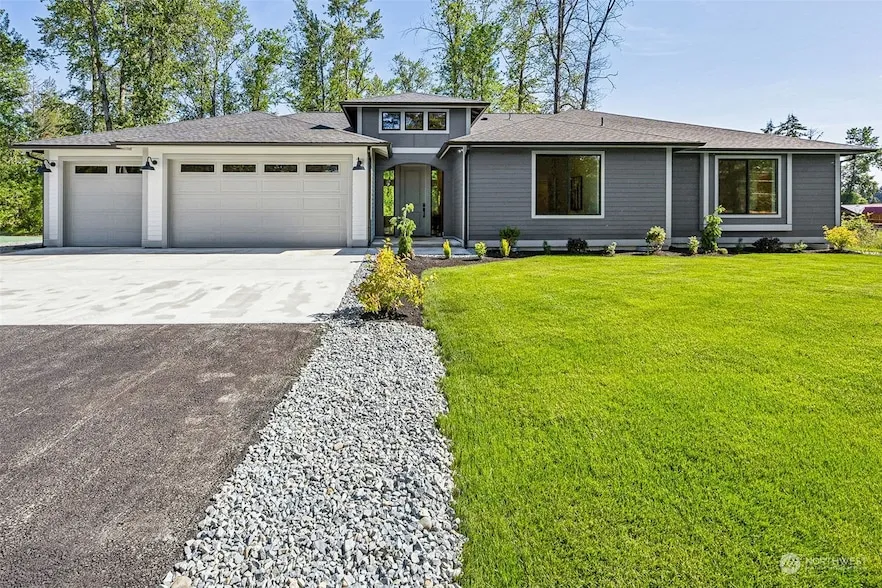 Built by Stennes Homes.. Modern custom-built rambler on private 2.08-acre lot W/RV Garage!! Entry W/14' ceilings! Great rm W/12 ceilings, floor-to-ceiling stone FP W/Douglas fir mantle! Cedar beams in entry/living. Chefs kitchen ft. quartz counters, white cabinets, 36 Smeg gas range, & soft close cabinets/drawers. Butlers pantry W/butcher block shelving & quartz counters. Huge primary W/vaulted ceilings, dual closets & spa-like 5-piece bath W/tiled shower, black quartz counters, & free-standing tub! 3 guest rooms + 1 guest bath ft. dual sink vanity. Sonos sound sys. Motion switches in pantry/laundry/master closet. Alarm sys. W/integrated home automation! Sound-resistant utility W/sink/storage! Patio W/stub for BBQ & landscaped yard!