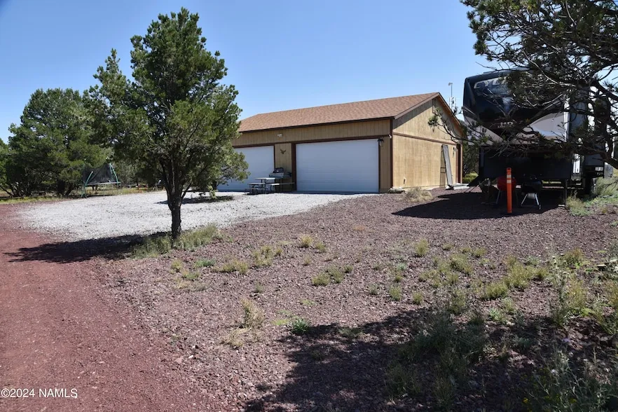 This 40x36 ft structure has a 400 sq ft efficiency 1-bed, 1-bath studio style living quarter on the back side and a 4-car garage on the front side of the building. The insulated building is on 2.1 acres and nestled in the trees. The property is located within 10 miles of Williams so going to town is easy. There are two RV hookups for guests to have access to water, septic and power. This could be a full-time home. The garage could become a house. For now, it is a great weekend getaway with lots of storage. SHOWN BY APPOINTMENT ONLY. SECURITY CAMERS PRESENT.