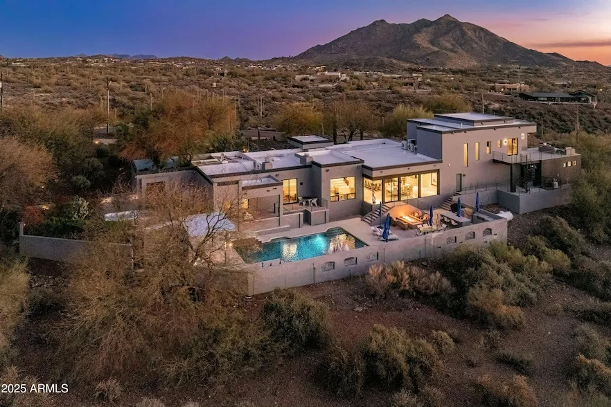 Stunning contemporary elegance in the heart of the beautiful Arizona desert surrounded by PHENOMENAL mountain views in every direction & positioned on a 2+ acre lot & desired N/S exposure. This home was entirely rebuilt in 2020 having the potential to expand w/ a guest house and/or larger footprint for equestrian fun. The kitchen is a chef's dream, w/ enormous (expansive) leathered granite covered island, featuring 2 prep/cleaning sinks, dual dishwashers, 6-burner Miele gas oven w/ steam oven, warming drawer, pot filler, built-in Dacor fridge and freezer wrapped in F1 custom cabinetry, & Hubbardton Forge lighting fixtures. The private pool & heated spa features a dedicated pool bathroom, ramada, & expansive area for outdoor entertainment. Car enthusiasts will salivate at the temperature controlled 4+ car garage w/ generous work area. Low-maintenance landscaping, tinted Fleetwood windows & doors, LED lighting t/o, electronic shades, 4 Rinnai tankless hot water heaters, water softener & R/O filtration systems deliver lower water & energy costs. Upper & lower Master suites w/ the upper suite featuring a stately slate tile wall, marble flooring & view deck w/ iron spiral staircase. This estate is located in an extremely quiet and private Cave Creek location, but minutes from shopping, entertainment, restaurants, art galleries, and hiking.