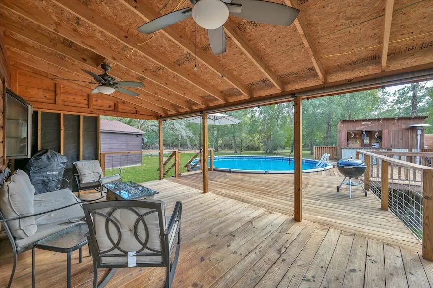 2 acres! Pool! Unrestricted! Don't miss this one... This spacious, unrestricted property on over 2 acres of land, offers endless possibilities! 4 bedrooms (including one downstairs that could be used as an office), 2.5 baths (plus extra 1/2 bath out by the pool), 1852 square feet, pool, and beautiful outdoor living space! Located in a serene and private corner of New Caney. Open floor plan with lots of natural light, 2024 new blinds throughout, covered porches front and back, a big detached garage with room to work, lots of parking space. Kitchen includes new dishwasher, granite counters, gas oven/cooktop (propane), pantry, tile floor, and lots of cabinets. New Roof - 2021. Original owner, meticulous maintenance! Landscaped front yard, open grounds with shade, areas for planting, and lots of storage. Furniture negotiable. NO MUD TAX! NO HOA! Horses allowed, low taxes, no MUD taxes, partially fenced.